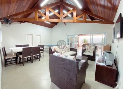 Sala de TV com lareira, sala de jantar, lavabo, ampla sala com bar, cozinha e lavanderia.
