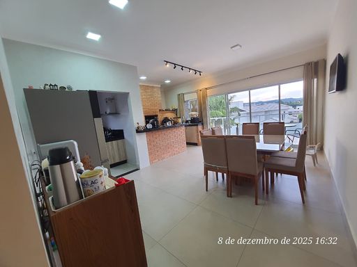 03 dormitórios, sendo 01 suíte com closet, sala de estar, sala de jantar integrada ao gourmet com churrasqueira, forno para pizza e banheiro completo, cozinha, banheiro social, lavanderia, garagem para 04 carros, sendo 02 cobertas e amplo quintal com piscina e banheiro.